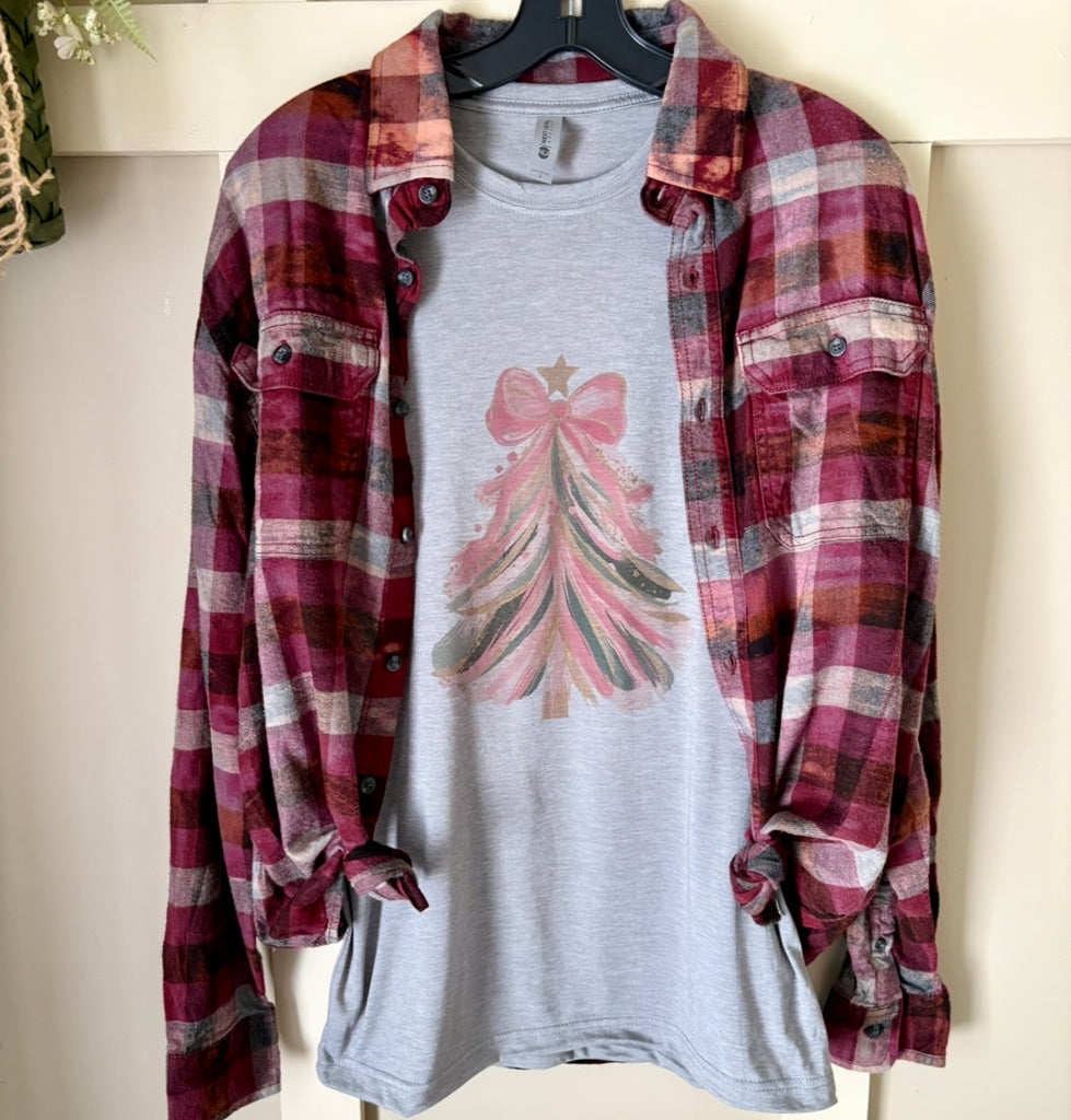 Pink Bow Christmas Tree Graphic T-Shirt & Bleach Dyed Flannel Shirt Set