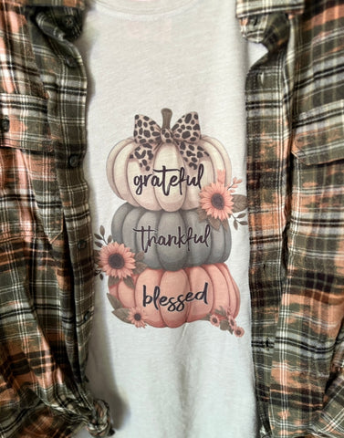 Grateful Thankful Blessed Pumpkin Stack Graphic T-Shirt & Bleach Dyed Flannel Shirt Set