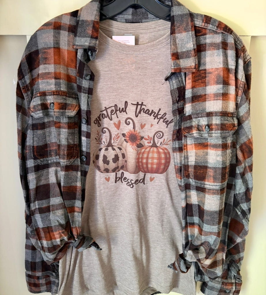Grateful Thankful Blessed Cow & Checker Print Graphic T-Shirt & Bleach Dyed Flannel Shirt Set