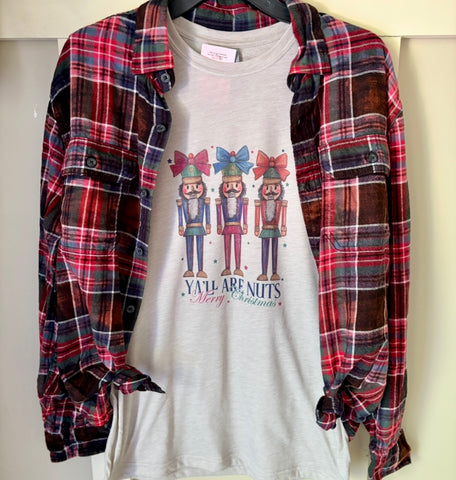 Nutcracker Y'all are Nuts" Merry Christmas Graphic T-Shirt & Bleach Dyed Flannel Shirt Set