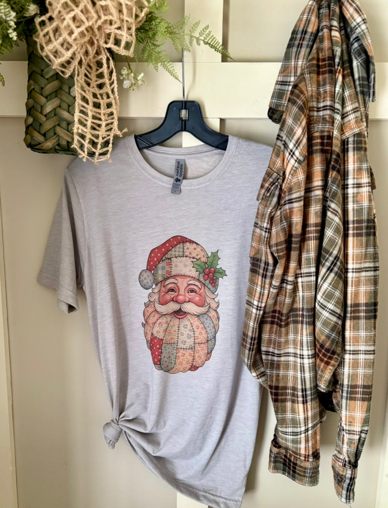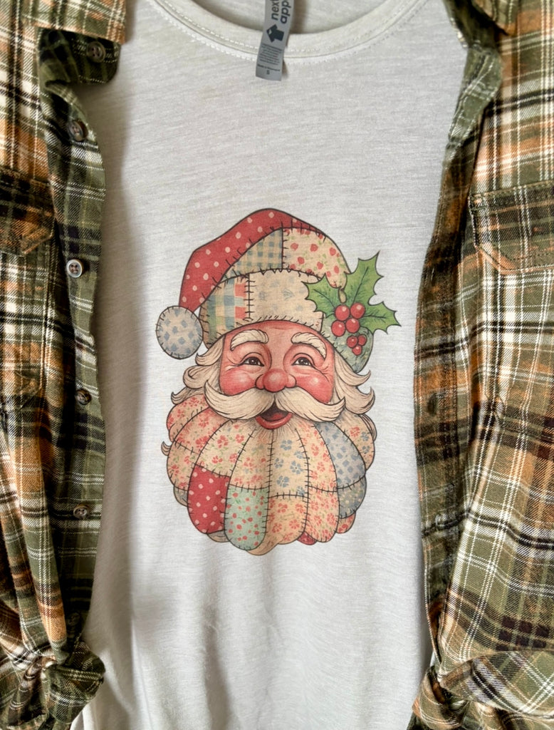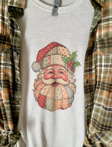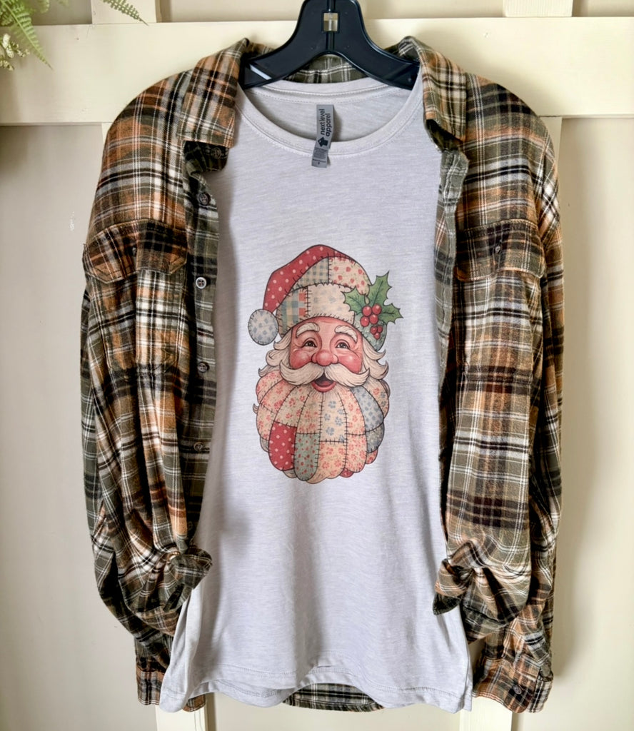Santa Retro Quilt Christmas Graphic T-Shirt & Bleach Dyed Flannel Shirt Set